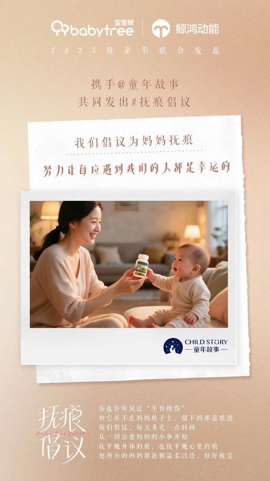 今年5月,童年故事毅然联合众多行业品牌,加入宝宝树发起的 “抚痕联盟” ,并共同发出 “抚痕倡议”。这一行动,打破了行业壁垒,汇聚多方力量,共同为女性的生育困境发声,呼吁家庭与社会给予妈妈们更多的理解、尊重与实质性的支持。