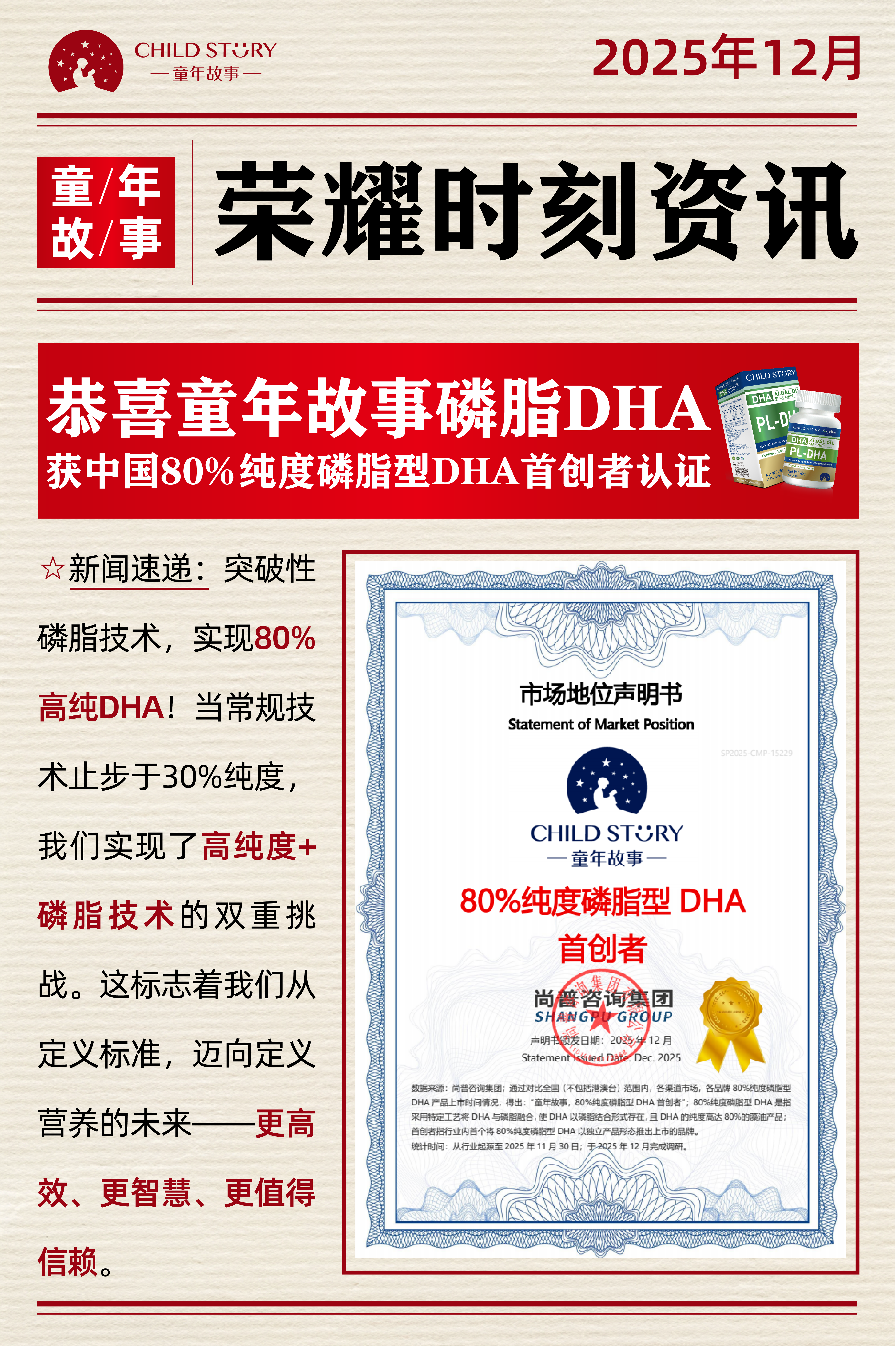 两份由尚普咨询集团出具的《市场地位声明书》,分别从创新深度与市场广度,彰显了童年故事在母婴营养领域的综合实力。我们始终坚持以科研驱动产品进化,以需求导向营养创新,持续为合作伙伴提供具有竞争力的产品解决方案。